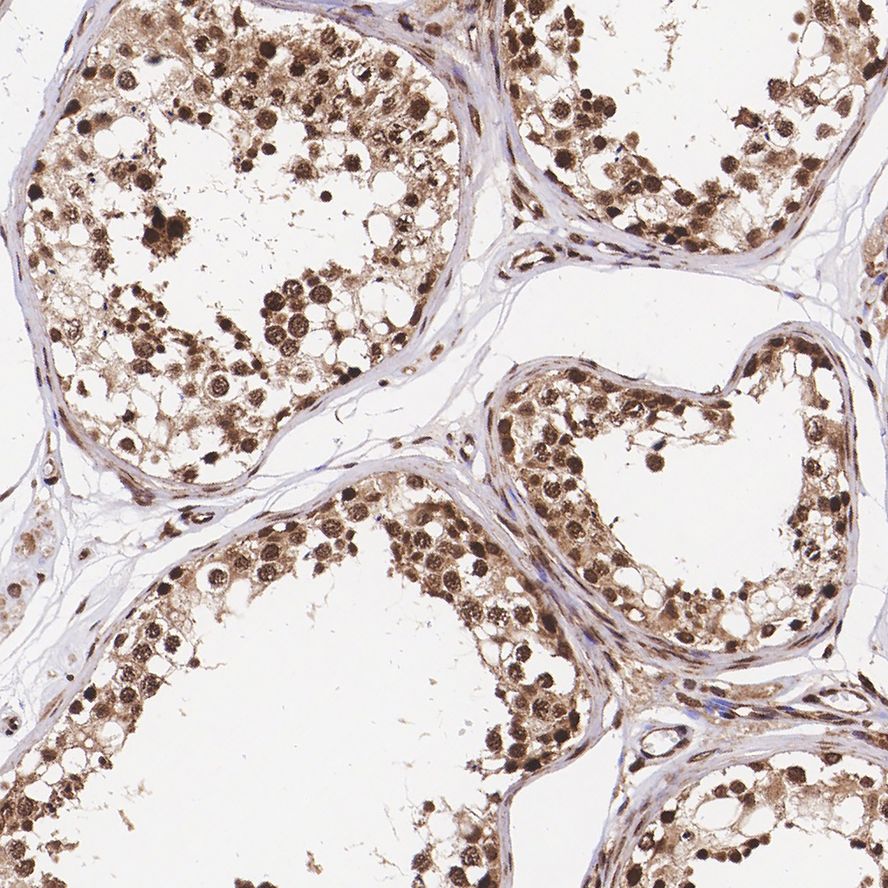 Immunohistochemical analysis of paraffin-embedded human testis tissue with Rabbit anti-Lin28A antibody (ARA838) at 1/1,000 dilution.