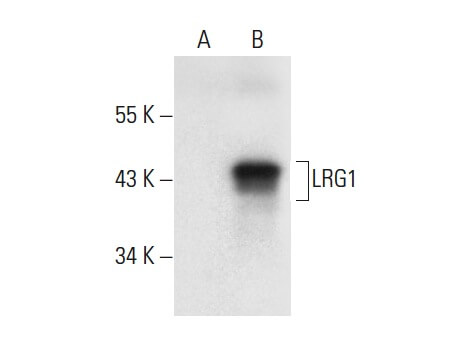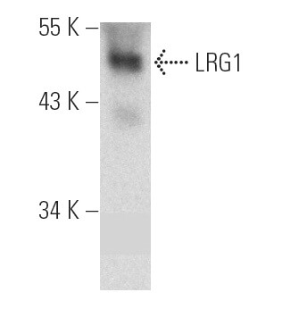 LRG1 (leucine - rich α - 2 - glycoprotein), also known as LRG, is a 347 amino acid secreted protein that contains eight LRR (leucine - rich) repeats and one LRRCT domain. The leucine - rich repeat (LRR) family of proteins, including LRG1, have been shown to be involved in protein - protein interaction, signal transduction, cell adhesion and development. Found mainly in plasma, LRG1 is expressed during granulocyte differentiation. The gene that encodes LRG1 consists of nearly 3,000 bases and maps to human chromosome 19p13.3. Chromosome 19 consists of over 63 million bases, houses approximately 1,400 genes and is recognized for having the greatest gene density of the human chromosomes. It is the genetic home for a number of immunoglobulin (Ig) superfamily members, including the killer cell and leukocyte Ig - like receptors, a number of ICAMs, the CEACAM and PSG families and Fc receptors (FcRs).