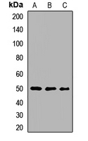 Western blot analysis of MAGEA4 expression in A375 (A), mouse liver (B), rat liver (C) whole cell lysates. (Predicted band size: 34 kD; Observed band size: 50 kD)