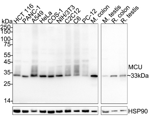 Western blot analysis of MCU on different lysates with MCU Mouse Monoclonal Antibody(ARA997).