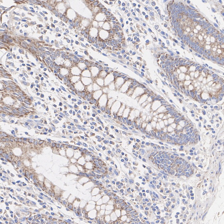 Immunohistochemical analysis of paraffin-embedded human colon tissue with MCU Mouse Monoclonal Antibody(ARA997).