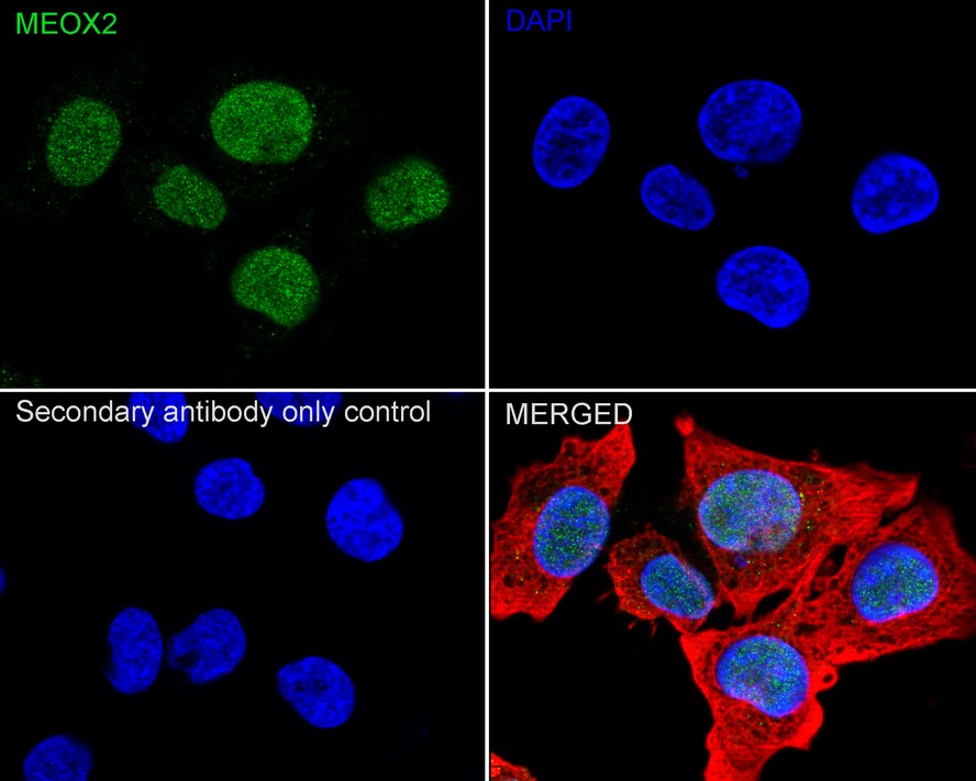 Immunocytochemistry analysis of A375 cells labeling MEOX2 with Rabbit anti-MEOX2 antibody.