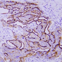 Immunohistochemical analysis of Mesothelin staining in human ovarian serous carcinoma formalin fixed paraffin embedded tissue section. The section was pre-treated using heat mediated antigen retrieval with sodium citrate buffer (pH 6.0). The section was then incubated with the antibody at room temperature and detected using an HRP conjugated compact polymer system. DAB was used as the chromogen. The section was then counterstained with haematoxylin and mounted with DPX.