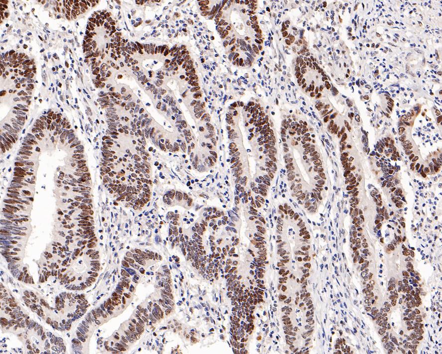 Immunohistochemical analysis of paraffin-embedded human colon carcinoma tissue with MSH6 Rabbit Monoclonal Antibody(ARA724).