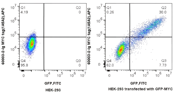 1x10^6 HEK-293 transfected with GFP-MYC were intracellularly stained with 0.25 ug MYC tag Rabbit Monoclonal antibody(ARA678) and Fluor 647 Mouse IgG(H+L) Goat Antibody . Cells were fixed with 4% PFA and permeabilized with Flow Cytometry Perm Buffer.