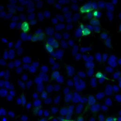 Immunofluorescent analysis of (-20°C Ethanol) fixed Transfected HEK-293 cells using MYC tag Rabbit Monoclonal antibody(ARA678) at dilution of 1:1000 and Fluor 488-Conjugated AffiniPure Mouse IgG(H+L) Goat Antibody.