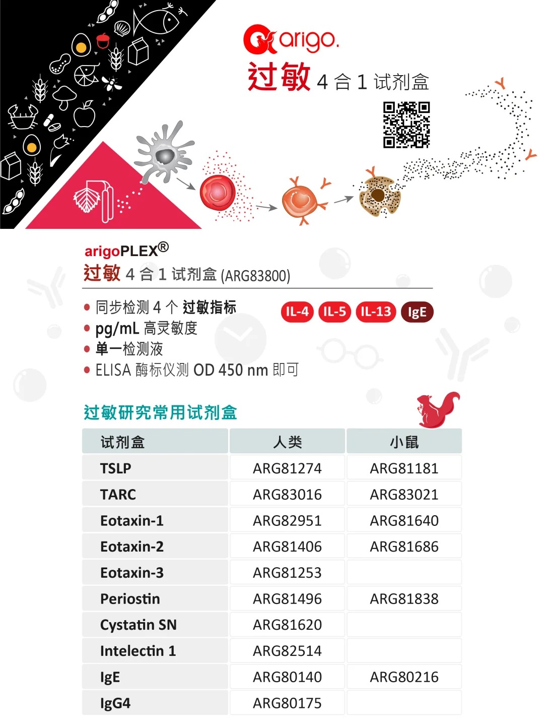 过敏指标对于评估过敏状况极为关键,常用的有血液 IgE 总量及 Th2 细胞因子 IL-4、IL-5、IL-13 等。arigoPLEX® 人类过敏 4 合1试剂盒(ARG83800)可同步检测以上 4 大过敏指标,助力了解过敏的免疫反应和监测过敏性疾病严重程度。