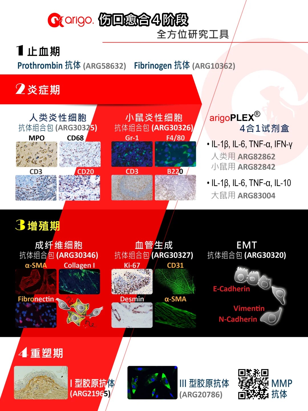 中性粒细胞、巨噬细胞协同清除坏死组织和病原体,并释放生长因子刺激成纤维细胞增殖。 arigoPLEX® 多因子试剂盒可通过血液 ELISA 检测炎症细胞因子,抗体组合包则支持免疫组化分析,助力多个层面深入分析炎症期动态。