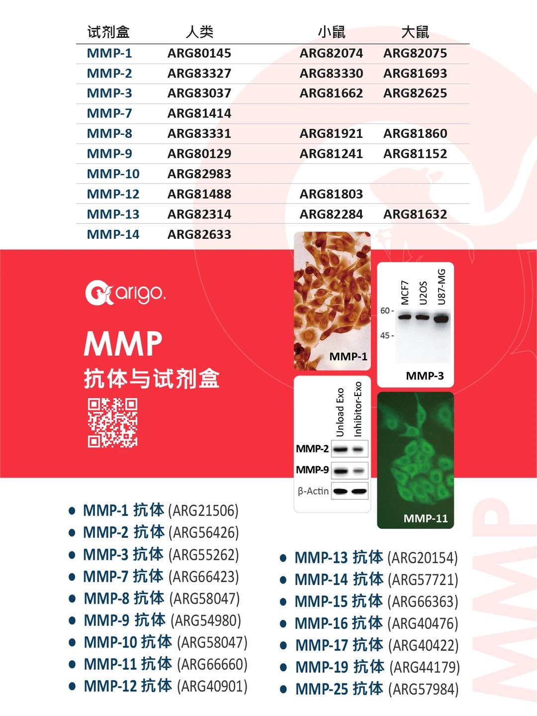 能降解明胶和基底膜主成分 IV 型胶原,与癌症进展和转移高度相关。arigo 的 MMP-2 (ARG56426) 与 MMP-9 (ARG54980) 抗体被多次引用于癌症研究,哈医大肿瘤医院和同济大学的课题组尤其爱用,同济大学就靠这支 MMP-9 抗体一年狂发 3 篇论文。而 MMP-9 试剂盒 (ARG80129) 则被用于包含阿尔茨海默病等多种疾病研究。