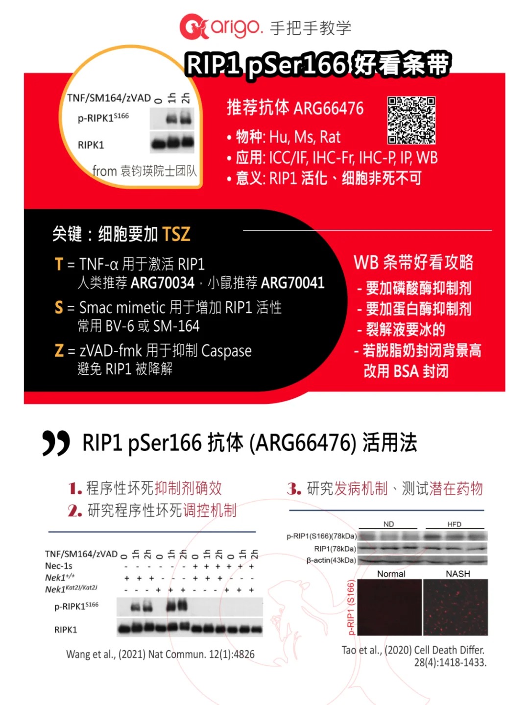 另外,WB 侦测 RIP1 pSer166 只适合细胞裂解液;用组织裂解液效果很差,不容易看清楚。若想在组织侦测 RIP1 pSer166,免疫组化较为理想。arigo 的 RIP1 pSer166 抗体 (ARG66476) 能做 ICC/IF、IHC-Fr、IHC-P、IP、WB,一支多用,性价比就是高。不只如此,还有 Necrosome (ARG30344) 及 Ripoptosome (ARG30350) 抗体组合包可深入研究凋亡和程序性坏死。