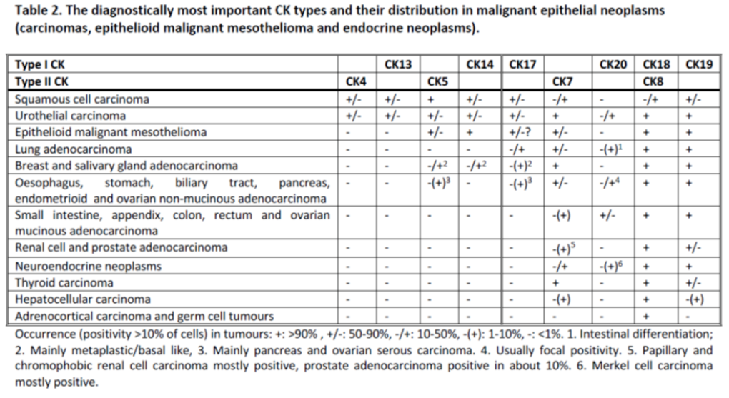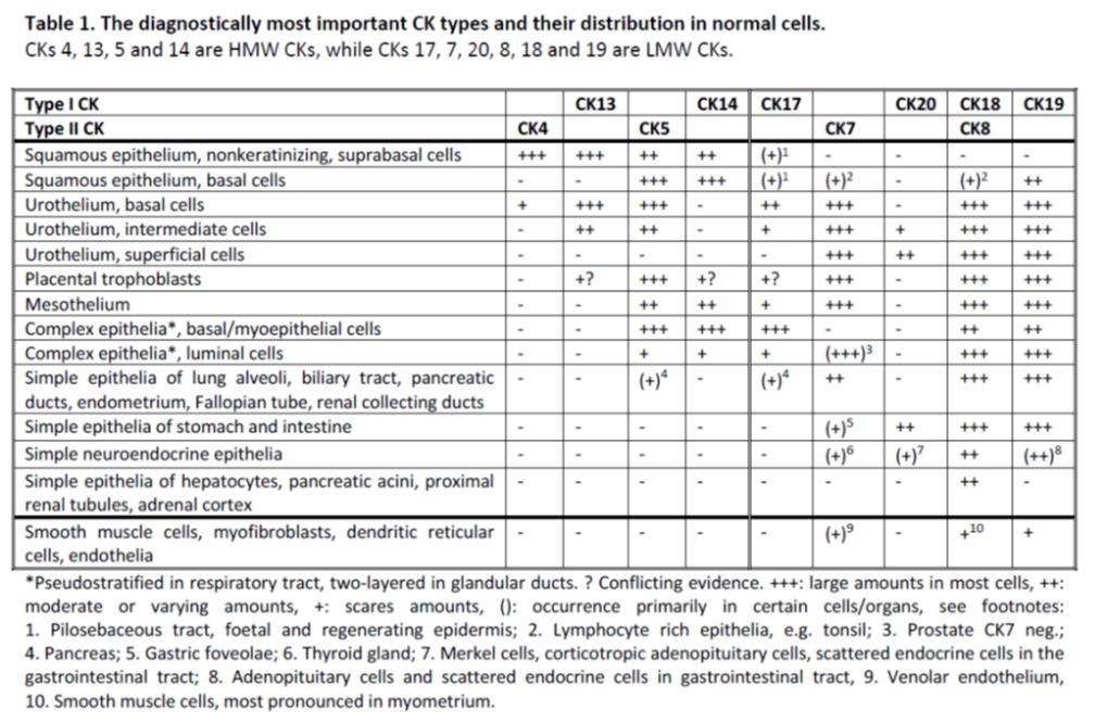 CK8/Ck18广泛存在于各种单层上皮和腺癌中,是广谱的上皮标志物;