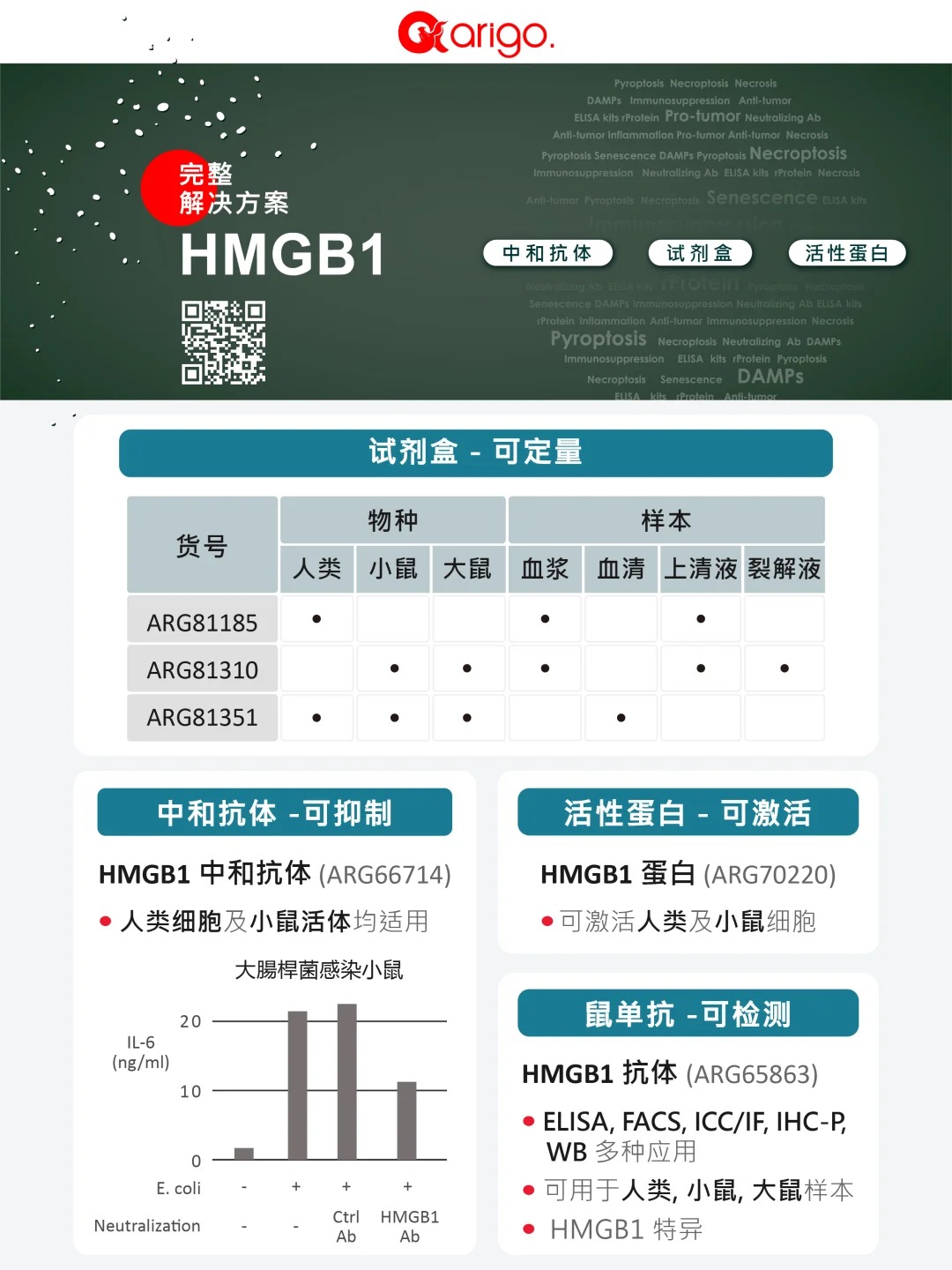 HMGB1 在细胞内发挥多种功能:核内的 HMGB1 可调节转录、复制和修复;胞浆的 HMGB1 可促进自噬;胞外的 HMGB1 可作为 DAMP 分子诱发炎症和免疫原性细胞死亡 (ICD)。HMGB1 与多种疾病相关,包括癌症、神经退行性疾病和炎症性疾病,靶向 HMGB1 对于疾病治疗极具潜力。arigo 有 HMGB1 全方位产品,不断积累国际论文引用,是研究 HMGB1 致病与治病机制必备工具,加速研究超给力!