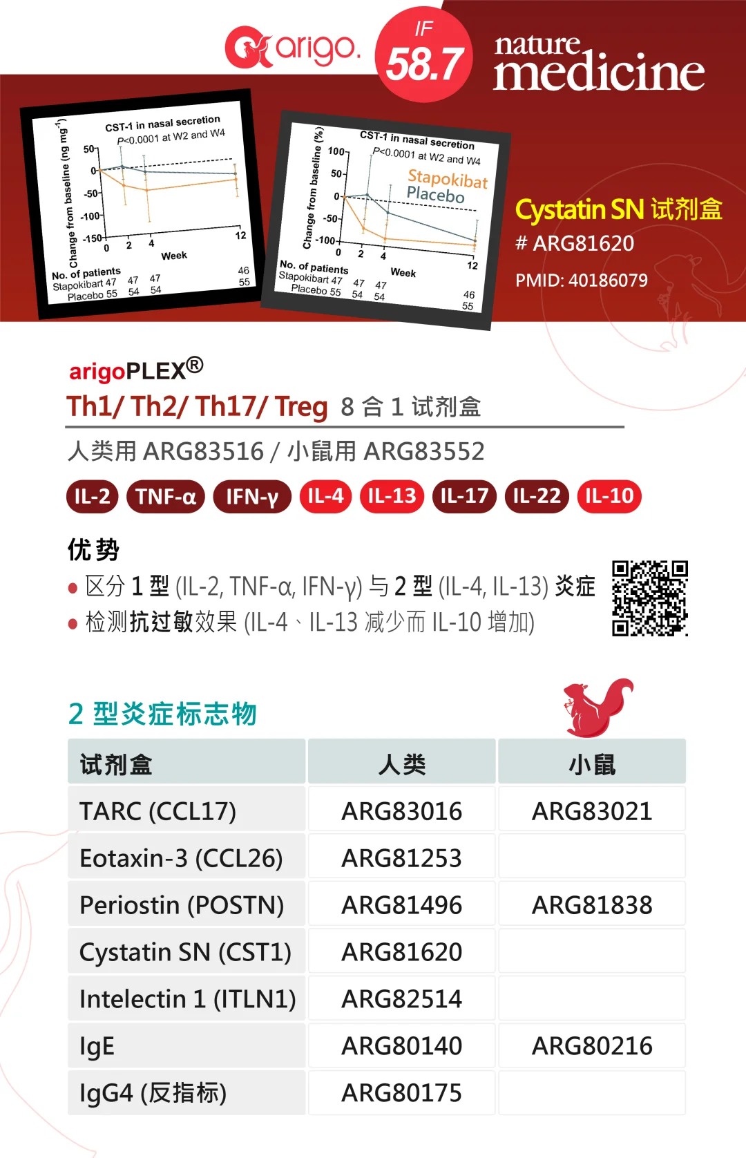 首都医科大学附属北京同仁医院的张罗教授、王成硕教授团队在国际期刊 Nature Medicine 发布重磅研究成果,证明新型生物制剂 IL-4Rα 药物司普奇拜单抗 (Stapokibart) 于 3 期试验中有效抑制过敏反应 (2 型炎症)、显著改善过敏性鼻炎,为数亿鼻炎患者提供了治疗新选择。arigo 的 Cystatin SN 试剂盒 (ARG81620) 被用于证明 “司普奇拜单抗显著降低 2 型炎症”,为药效验证提供有力的科学数据,让研究成果得以发表在顶级医学期刊 Nature Medicine,arigo 与有荣焉。(PMID: 40186079)