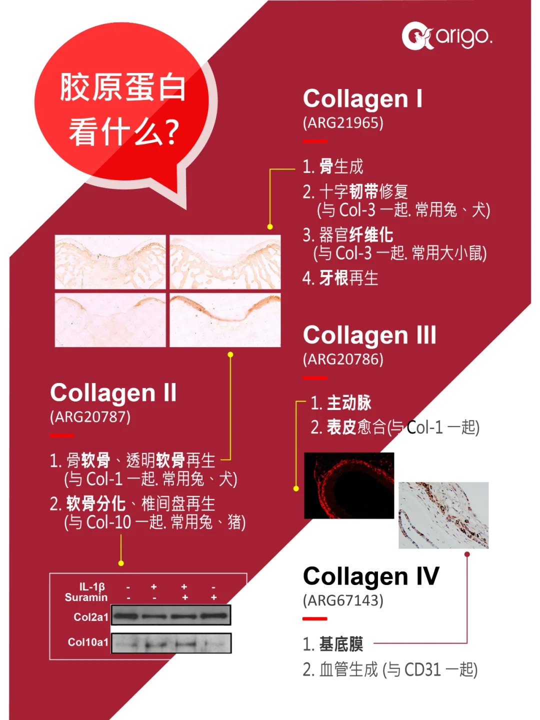 arigo 提供胶原蛋白全系列抗体:有常见的 I~IV 型胶原蛋白抗体,也有少见的其他胶原蛋白抗体。想找胶原蛋白抗体? 就找 arigo !