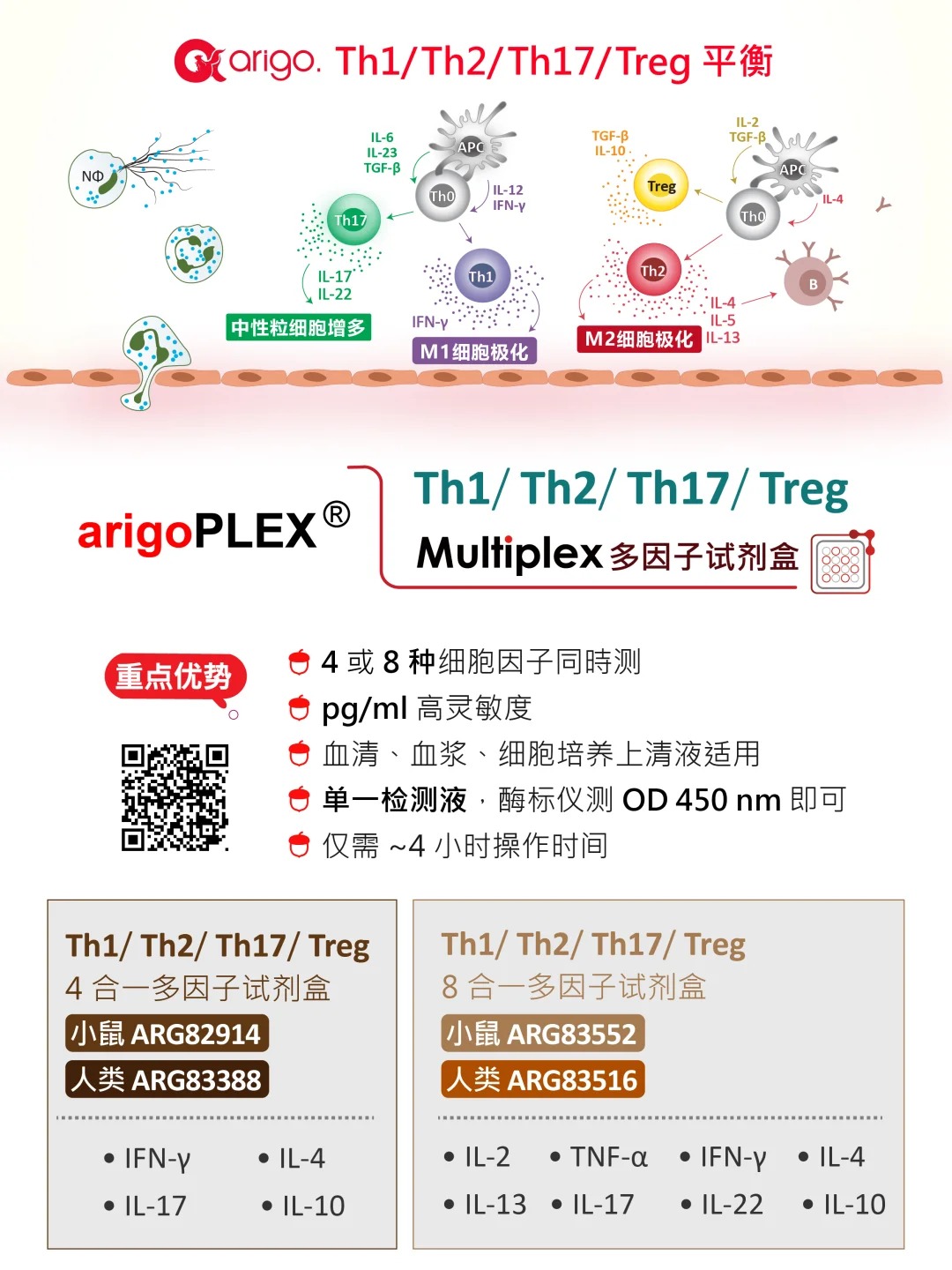 arigoPLEX®人类炎性趋化因子 4 合 1 试剂盒 (ARG83673) 滚烫出炉。这个试剂盒可同步检测 IL-8、MCP-1、RANTES、IP-10 共 4 个趋化因子,无论是监测感染、自身免疫性疾病、移植排斥或癌症进展都很给力。