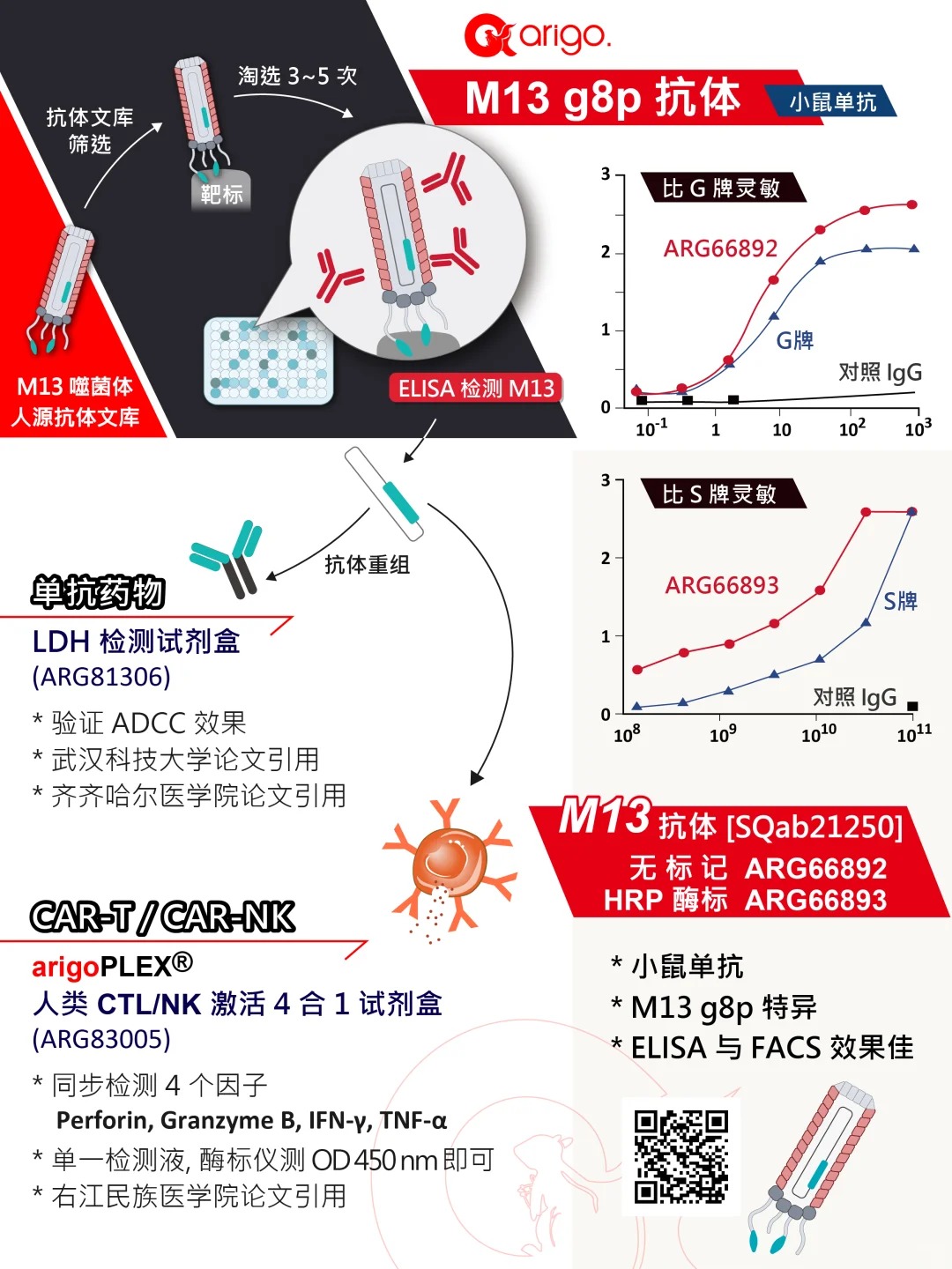 arigo 的 M13 抗体不只特异性好、灵敏度高,而且批次、供货都稳定,加速抗体新药筛选很给力。