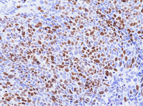 图3使用抗 Ki67 兔单克隆抗体(Clone RM521)对福尔马林固定和石蜡包埋的卵巢浆液性癌组织切片进行免疫组织化学染色,在室温下进行 1 小时。