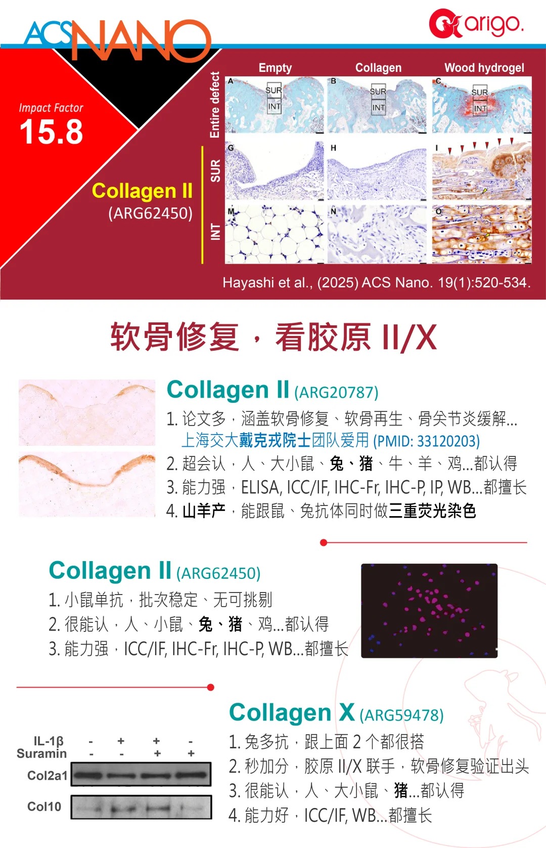 arigo 的 II 型胶原抗体 (ARG62450) 被高分文献引用了! 日本九州大学的课题组利用此抗体证明木材衍生的水凝胶可成功修复兔子的骨软骨缺陷,并发表于国际期刊 ACS Nano,arigo 与有荣焉。