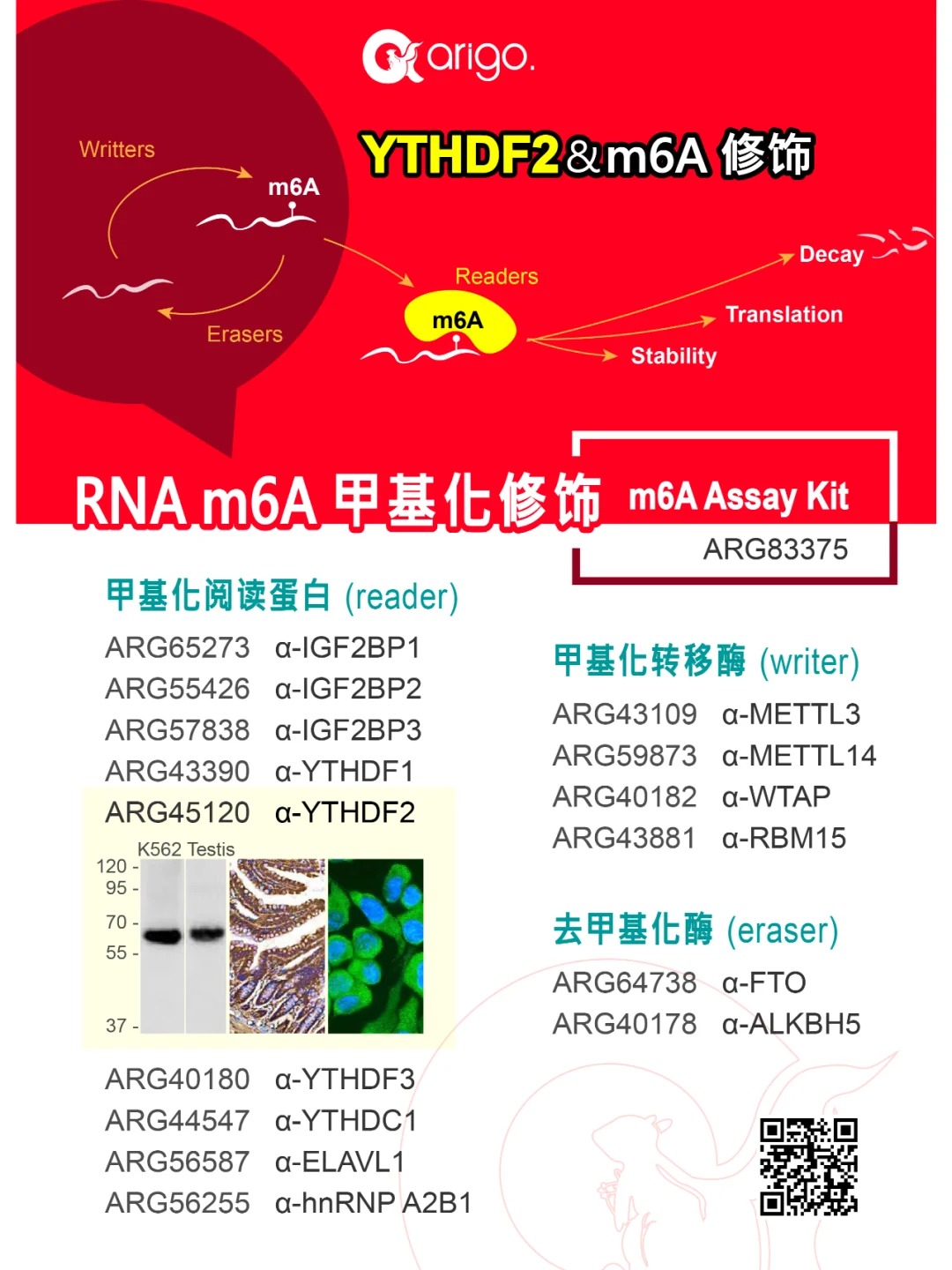 m6A 阅读蛋白 YTHDF2 可介导 mRNA 降解从而调控肿瘤发生、干细胞扩增、病毒感染和生育。研究显示 YTHDF2 于治疗癌症及某些炎症和纤维化疾病极具潜力,因此成为备受关注的热门靶点。arigo 提供优质抗体加速研究 YTHDF2 分子机制以及 m6A 介导的基因调控。