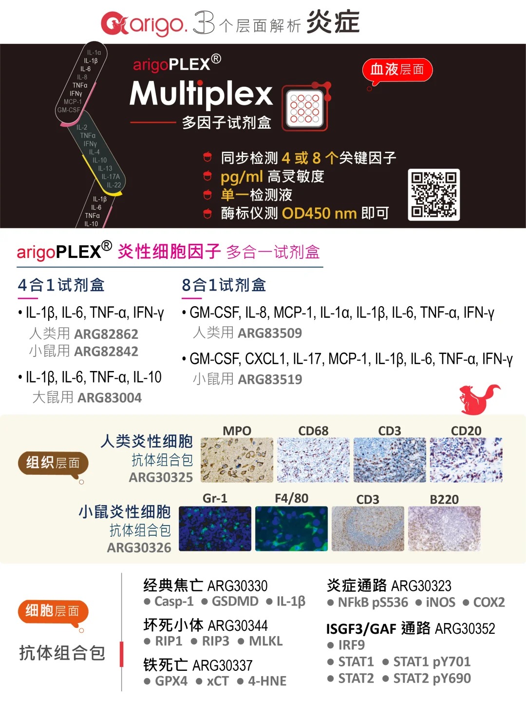 炎性细胞因子的功能是激活并募集炎性细胞至发炎组织,因此免疫组化看组织里的炎性细胞浸润是重要的炎症检测方法。arigo 的炎性细胞抗体组合包有早期 (中性粒细胞、巨噬细胞) 与晚期炎性细胞 (淋巴细胞) 标志物,IHC 金标准抗体超特异、超低背景,连小鼠免疫组化常见的 mouse-on-mouse 背景都排除。