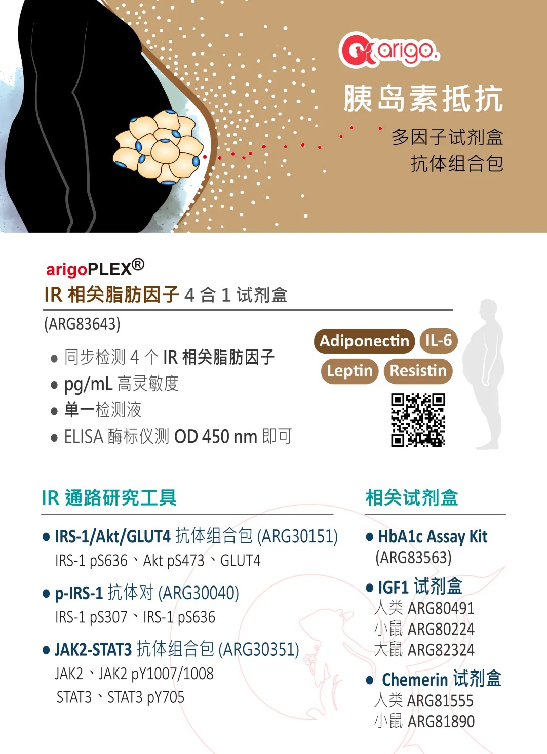 虽然胰岛素受体缺失会导致 IR,但是更多时候是由于肥胖、脂肪因子 (Adipokine) 分泌异常导致 IR。脂肪因子是脂肪组织分泌的激素和活性因子,已知特定的脂肪因子水平与胰岛素抵抗高度相关。arigo 推出了 IR 相关脂肪因子 4 合 1 试剂盒 (ARG83643) 可同步检测 4 个 IR 相关脂肪因子的水平,只要 4.5 小时,用酶标仪测 OD 450 nm 就能检测完成,加速胰岛素抵抗研究超给力 !
