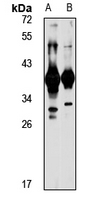 Western blot analysis of OTUD6A expression in mouse testis (A), rat testis (B) whole cell lysates. (Predicted band size: 33 kD; Observed band size: 37 kD)