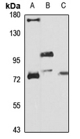 Western blot analysis of PLOD3 expression in HepG2 (A), mouse lung (B), rat liver (C) whole cell lysates. (Predicted band size: 84 kD; Observed band size: 85 kD)