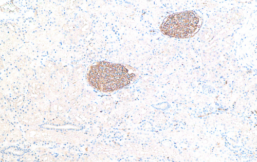 Immunohistochemical analysis of paraffin-embedded human kidney tissue slide using Podocalyxin Mouse Monoclonal Antibody(ARA996).