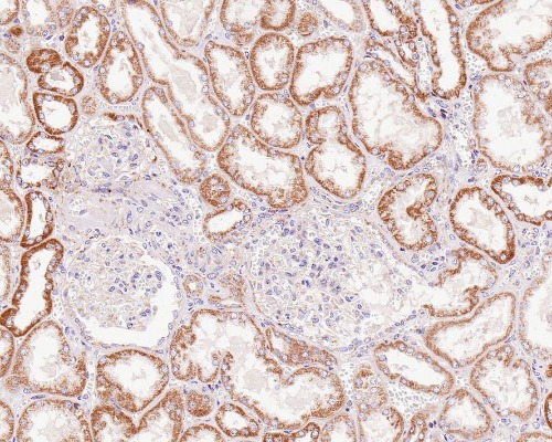 Immunohistochemical analysis of paraffin-embedded human kidney tissue with Prohibitin Rabbit Monoclonal Antibody(ARA729).