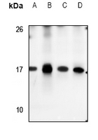Western blot analysis of S100-A7 expression in mouse testis (A), Hela (B), EC9706 (C), K562 (D) whole cell lysates. (Predicted band size: 11 kD; Observed band size: 17 kD)