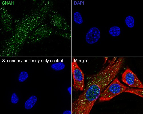 Immunocytochemistry analysis of NIH/3T3 cells labeling SNAIL with SNAIL Rabbit Polyclonal Antibody.
