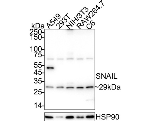 Western blot analysis of SNAIL on different lysates with SNAIL Rabbit Polyclonal Antibody.
