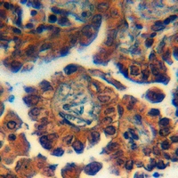Immunohistochemical analysis of SREB3/GPR173 staining in human lung cancer formalin fixed paraffin embedded tissue section. The section was pre-treated using heat mediated antigen retrieval with sodium citrate buffer (pH 6.0). The section was then incubated with the antibody at room temperature and detected using an HRP conjugated compact polymer system. DAB was used as the chromogen. The section was then counterstained with haematoxylin and mounted with DPX.