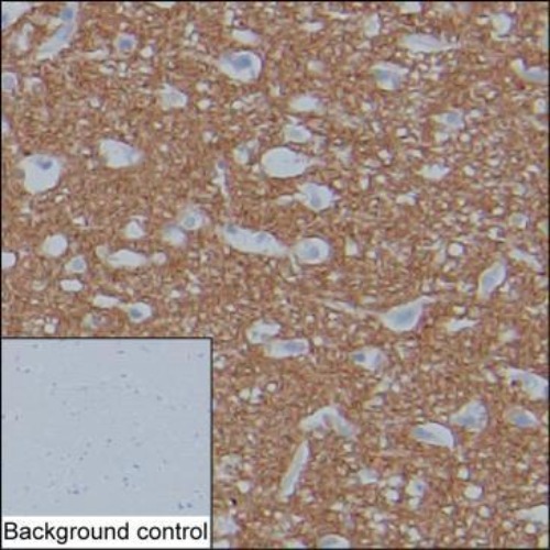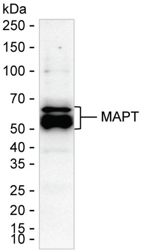 Tau is a neuronal microtubule-associated protein found predominantly on axons. The function of Tau is to promote tubulin polymerization and stabilize microtubules. The C-terminus binds axonal microtubules while the N- terminus binds neural plasma membrane components, suggesting that tau functions as a linker protein between both. Axonal polarity is predetermined by TAU/MAPT localization (in the neuronal cell) in the domain of the cell body defined by the centrosome. The short isoforms allow plasticity of the cytoskeleton while the longer isoforms may preferentially play a role in its stabilization. In its hyper-phosphorylated form, Tau is the major component of paired helical filaments (PHF), the building block of neurofibrillary lesions in Alzheimer's diseases (AD) brain. Hyper-phosphorylation impairs the microtubule binding function of Tau, resulting in the destabilization of microtubules in AD brains, ultimately leading to the degeneration of the affected neurons. Numerous serine/threonine kinases phosphorylate Tau, including GSK-3beta, protein kinase A (PKA), cyclin-dependent kinase 5 (cdk5) and casein kinase II. Hyper-phosphorylated Tau is found in neurofibrillary lesions in a range and other central nervous system disorders such as Pick's disease, frontotemporal dementia, cortico-basal degeneration and progressive supranuclear palsy.