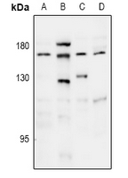 Western blot analysis of Thrombospondin 1 expression in HCT116 (A), HEK293T (B), CT26 (C), PC12 (D) whole cell lysates. (Predicted band size: 129 kD; Observed band size: 180; 130 kD)
