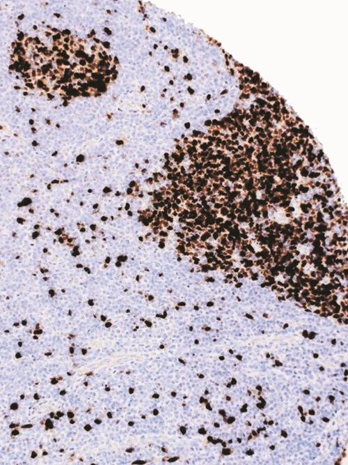 Immunohistochemical staining of human tonsil tissue using TOP2A Mouse Monoclonal Antibody (ARM581).