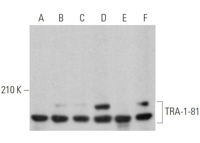 TRA - 1 - 81 (TRA - 1 - 80). Western blot analysis of TRA - 1 - 81 expression in ECV304 (A), Raji (B), MIA PaCa - 2 (C), HeLa (D), Jurkat (E) and NTERA - 2 cl.D1 (F) whole cell lysates.